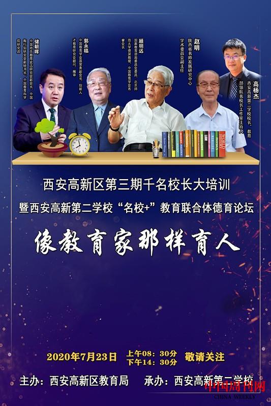 ——西安高新區(qū)第三期千名校長大培訓(xùn)暨西安高新第二學(xué)校“名校+”教育聯(lián)合體德育論壇紀(jì)實報道2020年是西安市基礎(chǔ)教育提升三年行動計劃的重要一年,也是高新區(qū)實施“1346”計劃爭當(dāng)教育強(qiáng)市先行示范區(qū)的攻堅之年。7月23日,由高新區(qū)教育局主辦,西安高新第二學(xué)校承辦的“像教育家那樣育人”西安高新區(qū)第三期千名校長大培訓(xùn)暨西安高新第二學(xué)校“名校+”教育聯(lián)合體第六屆德育論壇開展了線上直播,活