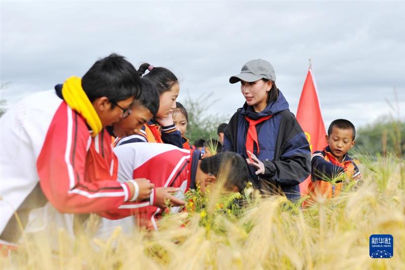 日喀則市上海實驗學(xué)校的學(xué)生們在青稞地里聽講解(9月17日攝)。 時下正值青稞成熟的季節(jié),西藏日喀則市上海實驗學(xué)校40余名師生來到日喀則市甲措雄鄉(xiāng),參與當(dāng)?shù)氐那囡崭睿选八颊n”上在青稞地里。學(xué)生們在實踐中體會勞動的艱辛,在收獲中感受勞動的快樂。 新華社發(fā)(潘杰 攝)日喀則市上海實驗學(xué)校德育副校長潘杰和學(xué)生在青稞地里交流(9月17日...