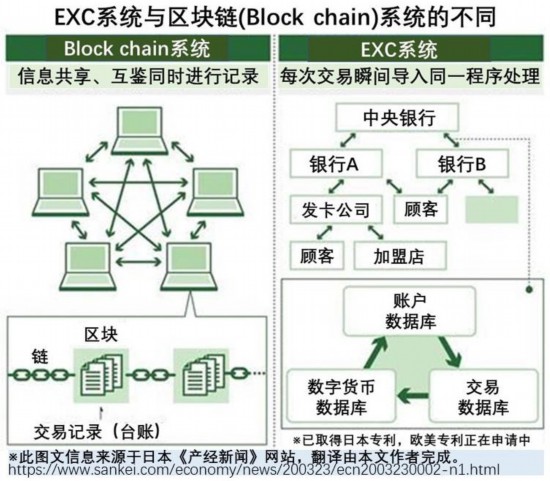 日本GVE公司基于日本索尼FeliCa近距離無線通訊技術(NFC)及相關國際標準基礎,進一步集成開發了由中央銀行控制的新一代虛擬貨幣 EXC及其手機電子支付軟硬件系統,實現了比區塊鏈技術安全性更高的數字貨幣“發行信息”“賬戶信息”“交易信息”3個數據庫的同步加密更新,并已于2018年獲批日本發明專利(國際專利正在申請中)。如圖1所示。