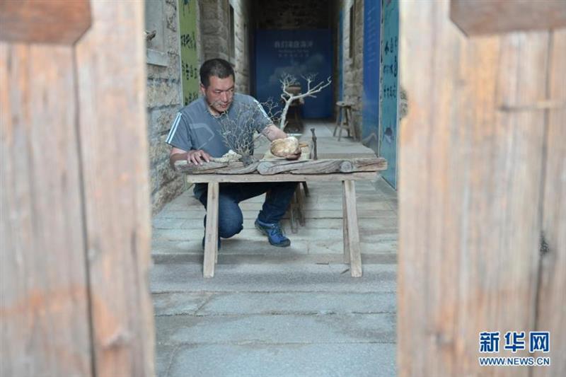 4月19日,蔡競翔在被改造為海漂藝術(shù)品陳列館的老宅里用船木、貝殼和珊瑚骨進(jìn)行創(chuàng)...
