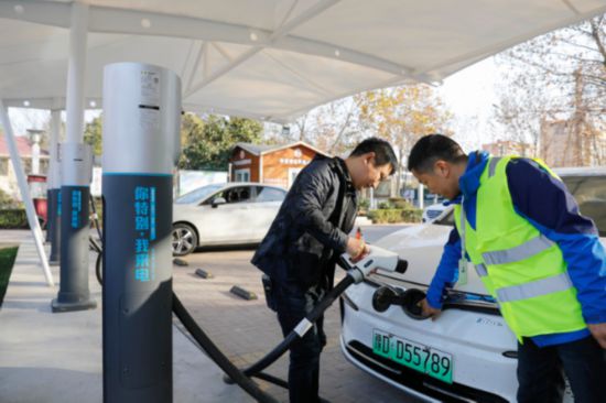 2021年11月26日,在河南省寶豐縣龍興湖公園,市民使用充電樁為新能源車充電。 新華社發(fā)(何五昌 攝)