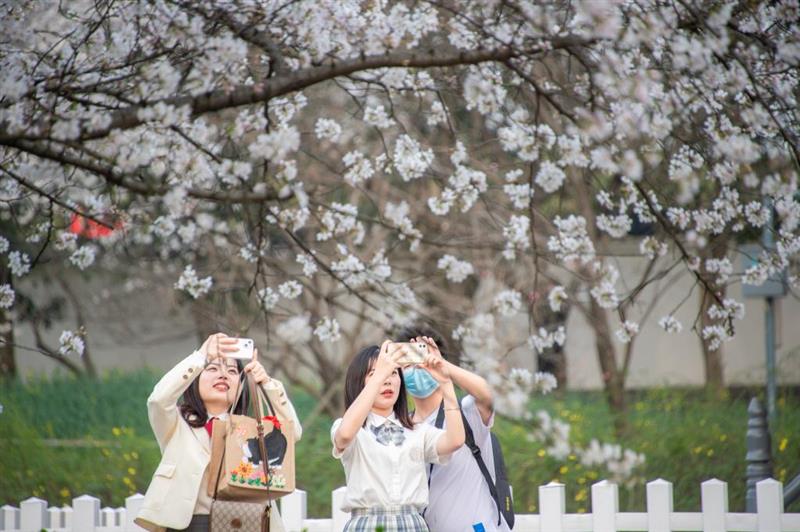 2022年3月14日,游客在武漢東湖櫻園賞櫻拍照。新華社記者伍志尊 攝