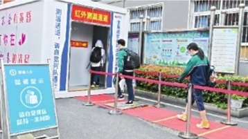 青山區鋼城八中學生走紅地毯通過紅外測溫設備 長江日報記者李子云 攝