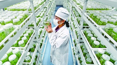 陜西省榆林市定邊縣一家馬鈴薯良種繁育基地的技術人員在組培室里查看馬鈴薯苗。新華社發