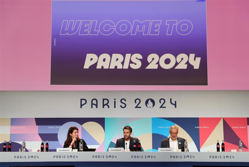 ??7月21日,巴黎奧組委主席托尼·埃斯坦蓋(中)在發布會上發言。新華社記者 王東震 攝