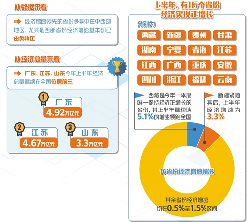 在西部12個省份中,西藏上半年經(jīng)濟增速為5.1%,比一季度加快4.1個百分點。四川、重慶等9個省份的經(jīng)濟增速由負轉(zhuǎn)正。其中,重慶回升幅度最大,由一季度下降6.5%轉(zhuǎn)為增長0.8%。