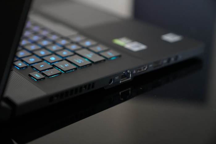 接口方面,ROG的冰刃4新銳比較豐富。左側為電源輸入接口、網線接口、HDMI 2.0b接口、USB 3.2 Type-A Gen 2 10Gbps接口,3.5毫米麥克風和耳麥二合一接口。右側為雷電3接口,集成DisplayPort 1.4與PD充電,兩個USB 3.2 Type-A Gen 1 5Gbps接口。機身尾部與側面有4個出風口,可以完美解決散熱的問題。