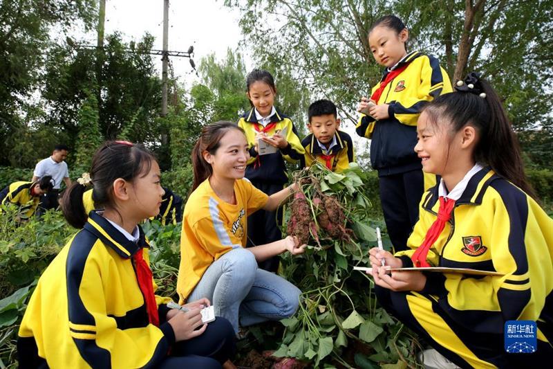 9月24日,在棗莊市市中區(qū)中興小學(xué)的勞動(dòng)實(shí)踐基地,老師李肖琳(前中)在向?qū)W生講解地瓜的栽培知識(shí)。
