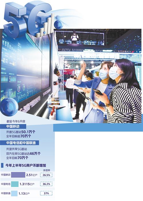 從5G基站看,截至今年6月底,中國移動已開通5G基站50.1萬個,全年目標超過70萬個;中國電信和中國聯通共建共享5G基站,目前雙方在用5G基站達46萬個,全年目標也是70萬個。工信部數據顯示,截至今年6月底,我國累計建設5G基站96.1萬個,覆蓋全國所有地級以上城市,5G手機終端連接數達3.65億戶,占全球80%以上。